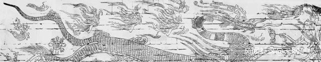 晉 羽人戲龍。這條龍是介於獸身和蛇身之間的,説是獸身,太長了,説是蛇身,四肢太強壯了。這張圖體現出當時的畫家對於龍這種從未見過的生物的想象是在獸身和蛇身之間來回橫跳的。