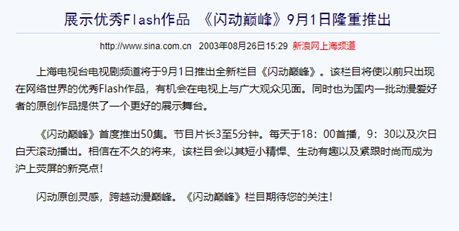 在網絡文創方興未艾的當年,中國動畫民間力量的曾集中體現在FLASH的製作上。閃動巔峯則收集了國內主要FLASH網站和知名閃客高手作品,如《大話三國》《小破孩》等網絡知名FLASH動畫。它是少數展示電腦動畫和FLASH精品傑作的電視節目之一。