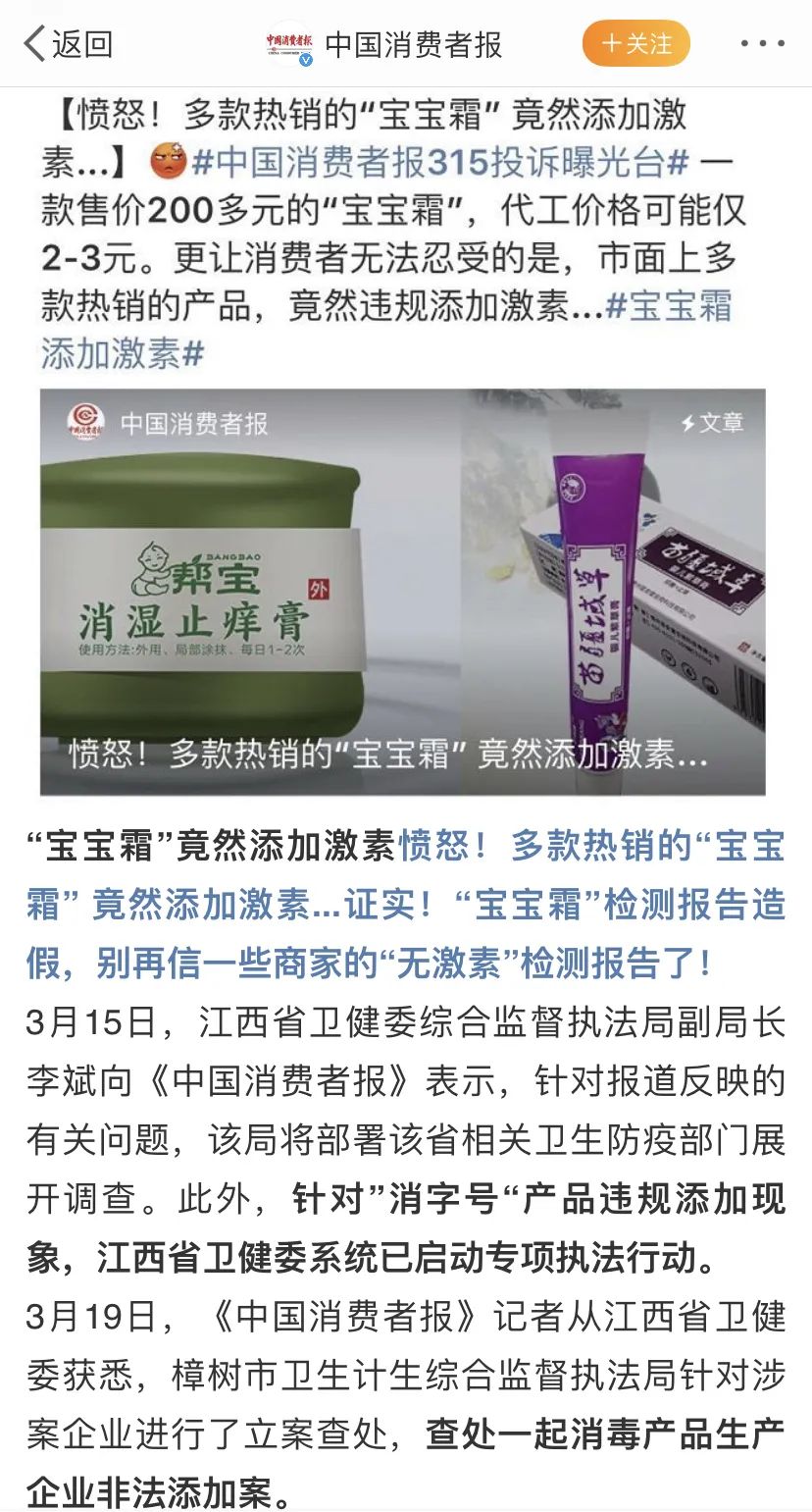 近一點的2019年,《中國消費者報》曝出6款嬰兒霜,違規添加激素。