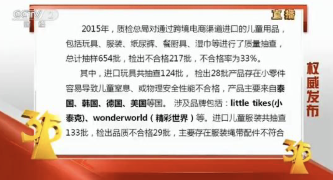 遠一些的,2016年央視315晚會發布的調查結果顯示,海淘兒童用品抽檢中有三分之一不合格。