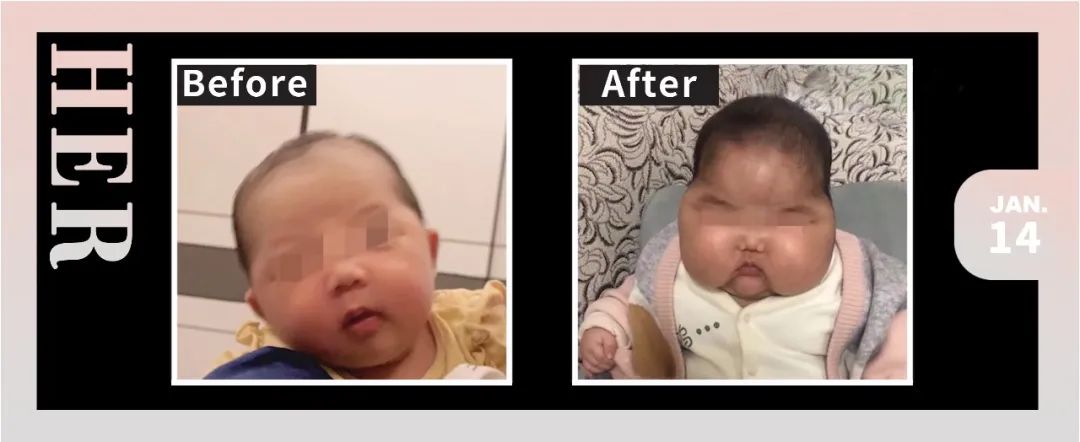 在過去2個月的時間內,她從一個腦袋只有巴掌大的嬰兒,變成一個臉部腫大、額頭長出無數細小毛髮的小孩。