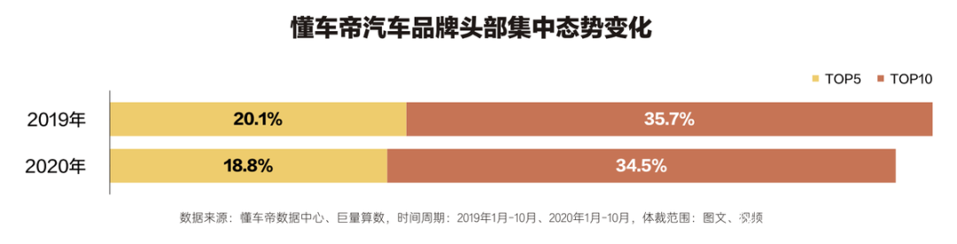 而從線上品牌的聲量競爭來説,構建了全新的競爭格局。根據懂車帝《白皮書》,2020年Top5品牌的閲讀量佔比僅有18.8%,Top10品牌的閲讀量佔比也僅有34.5%,也就是説線上資訊場的聲量競爭仍有重塑空間。