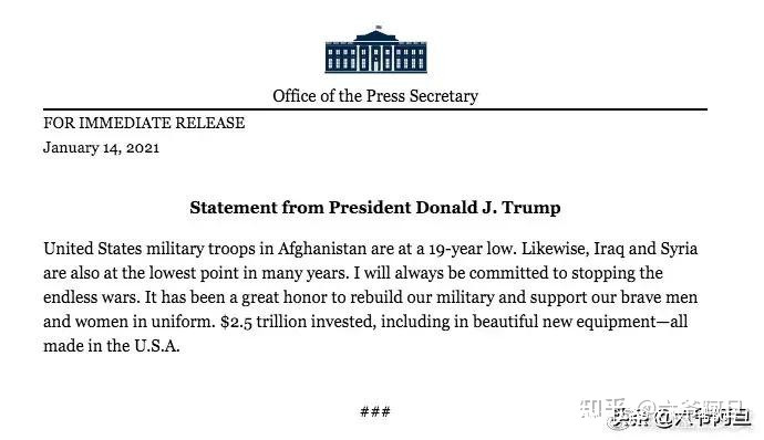 美國在阿富汗的軍事力量處於19年來低點。同樣,在伊拉克和敍利亞的軍事力量也處於多年來的最低點。我將始終致力於停止無休止的戰爭。我為重建我們的軍隊並支持我們勇敢的軍人感到非常榮幸。
