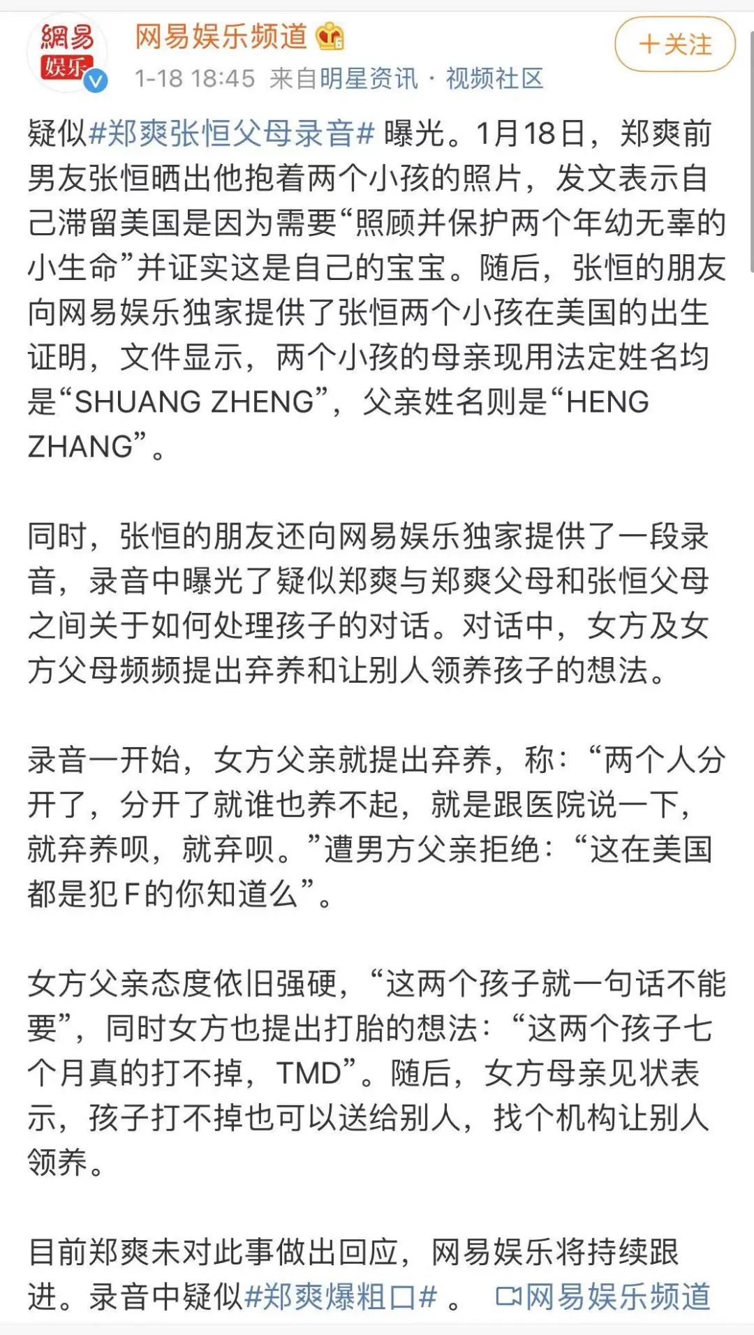 今天中午,鄭爽前男友張恆發文透露,自己滯留美國,就是因為需要**“照顧並保護兩個年幼無辜的小生命”。**