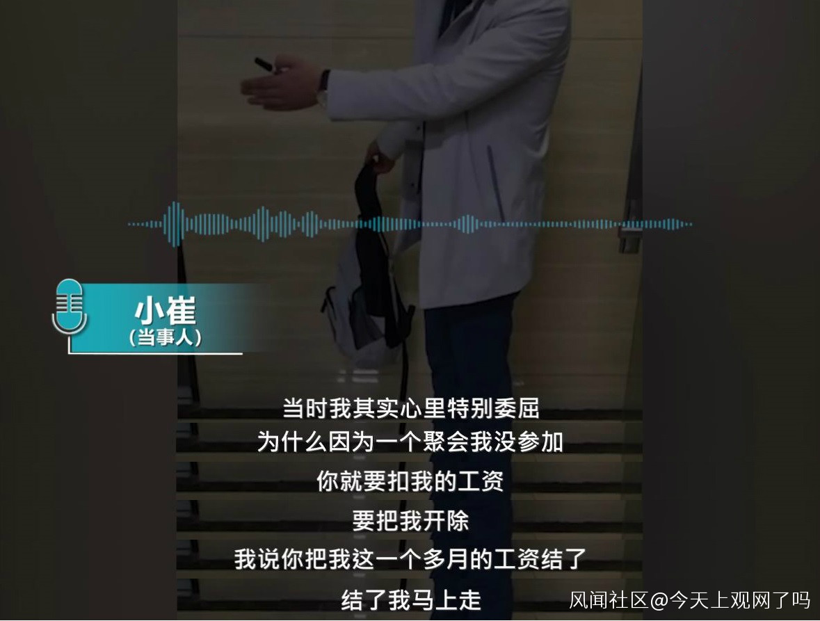 小崔對此感到不可思議,“當時我其實心裏特別委屈,為什麼因為一個聚會我沒參加,你就要扣我的工資,要把我開除。我説你把我這一個多月的工資結了,結了我馬上走。”
