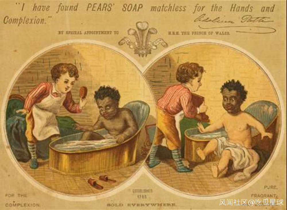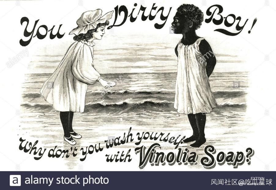 利用種族歧視玩梗的還有vinolia soap,他們打着鐵達尼號頭等艙專用肥皂的旗號,站在買得起鐵達尼號頭等艙的貴族們的角度上,毫不掩飾地直接宣稱髒就是黑人的代名詞。