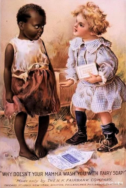 Fairy soap的廣告緊隨時代潮流,在種族歧視的大環境下,絲毫不藏着掖着。骨子裏是刻意端着的英國紳士,外面則披着一層美國人的驕躁和狂妄。二者相結合,不僅加重了英國人暗戳戳的嘲諷意味,也委婉了美國人的明晃晃的魯莽行徑。