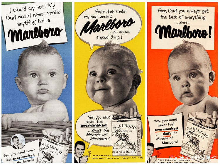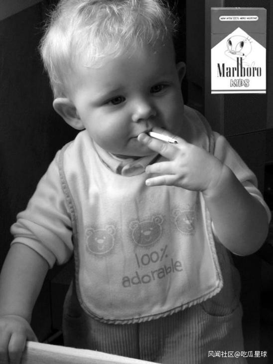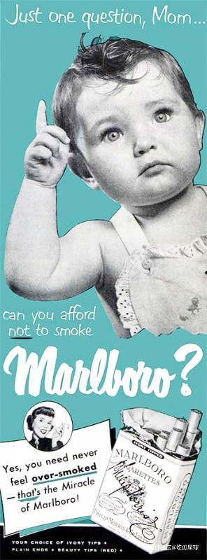 當然,萬寶路香煙早期的廣告傑作不止這些,不僅利用嬰兒作為自己香煙廣告的重要組成成分,為了進一步壓榨嬰兒的價值,推出了一款兒童版萬寶路。