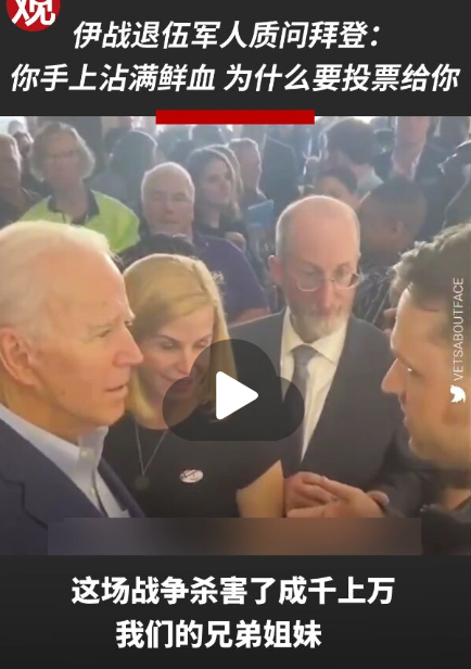 去年三月一個美國退役軍人就當面質問他:“你手上也沾滿了他們的血,你不配(做總統),我的朋友因你們的政策而死…..你絕不可能成為總統!數百萬人死在伊拉克……特朗普都比拜登更反戰!”