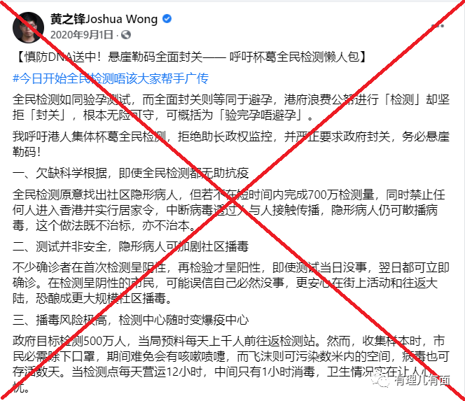 黃之鋒等“ 港獨 ”分子污衊新冠病毒檢測是 “中國(內地)實驗室正收集香港人DNA”,“DNA會被送到新成立的國安機構”。