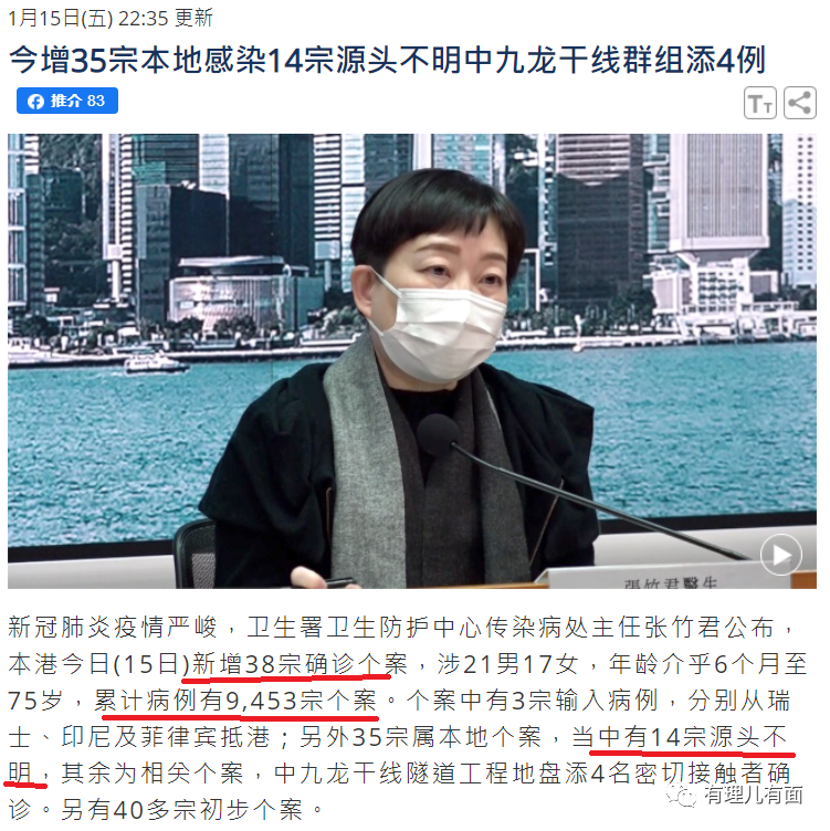 1月15日,港媒香港東網以《 今增35宗本地感染14宗源頭不明中九龍幹線羣組添4例 》為題,報道 了 香港新 冠肺炎疫情的最新發 展。