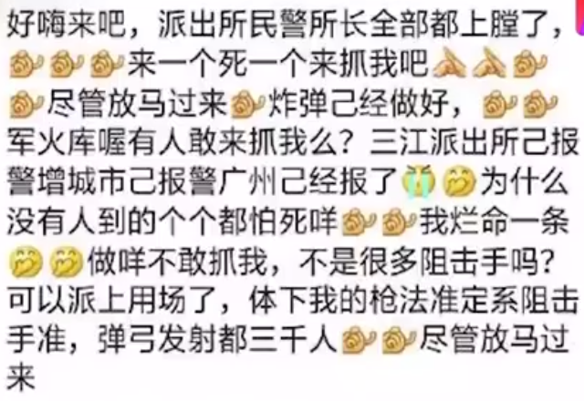 求錘得錘的不止他一個,去年4月26號廣州增城石灘鎮一名男子發朋友圈,説自己有槍支,還對警察進行挑釁。警方接到報警後趕到現場,對其進行勸誡,結果該男子躲回屋內拒不配合。到了晚上11點,又突然衝出來朝警方開槍,為了制止他繼續犯罪,民警果斷開槍將其擊傷,送往醫院後搶救無效死亡。這可能就是真的活膩歪了吧…