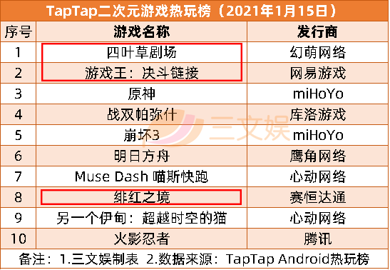 TapTap二次元遊戲熱玩榜方面,新晉榜單《四葉草劇場》登頂榜首,這是一款由幻萌網絡研發的魔物娘養成遊戲。截至1月15日,該遊戲在TapTap上有23.35****萬人安裝、42.54萬人關注。