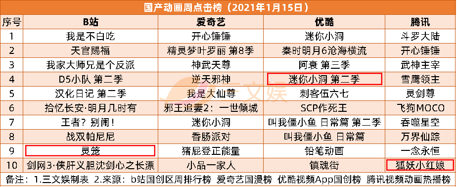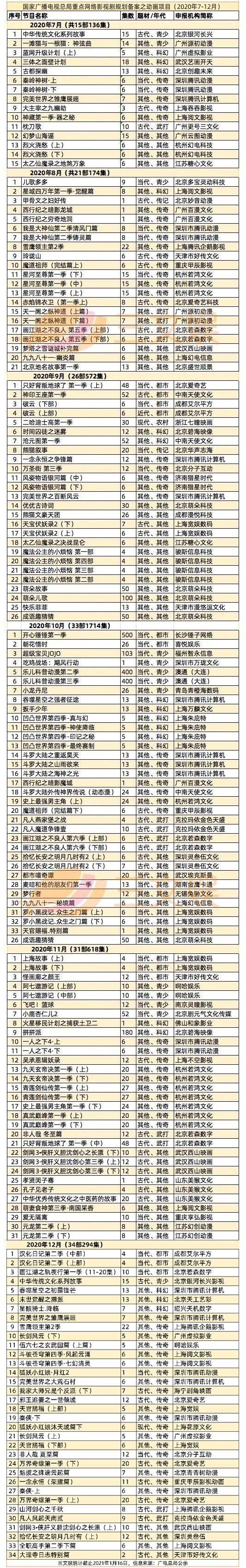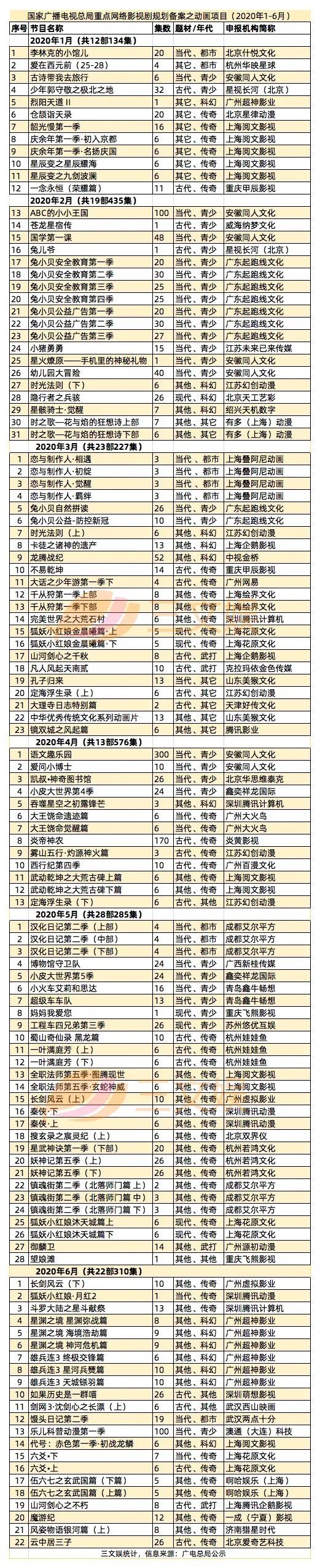 1月11日,廣電總局發佈了2020年第四季度全國重點網絡影視劇上線登記備案情況。此次備案的網絡動畫有34部共294集。