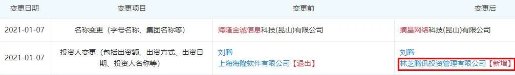 1月7日,摘星網絡科技(崑山)有限公司**(下稱摘星網絡)**發生工商變更,投資人新增林芝騰訊投資管理有限公司,佔股比例70%為第一大股東。