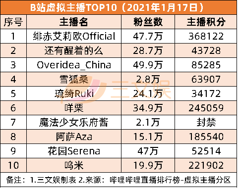 排名第三位的Overidea_China則是來自日本的多媒體偶像集團,由虛擬youtuber京華創立並運營。特點是由多個虛擬youtuber用包括日語、英語、中文多種語言、多個領域的人們一起製作一個作品羣。截至1月17日,Overidea在B站累計了49.9萬粉絲,直播積分為8.53萬分。