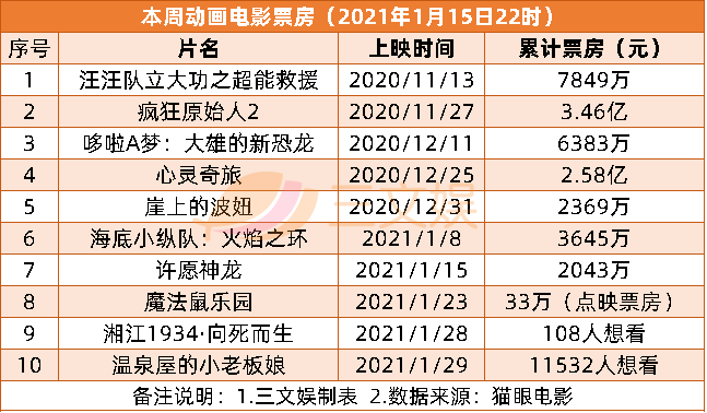 **動畫電影方面,**截至1月15日22時,《瘋狂原始人2》斬獲票房3.46億元,同時,貓眼上調其預測總票房為3.47億元。