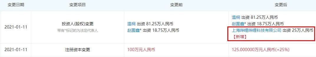 1月11日,成都洛斯特網絡科技有限公司**(下稱洛斯特網絡)**發生工商變更,投資人新增上海嗶哩嗶哩科技有限公司,持股比例20%為第二大股東。註冊資本由100萬元變更為125萬元。