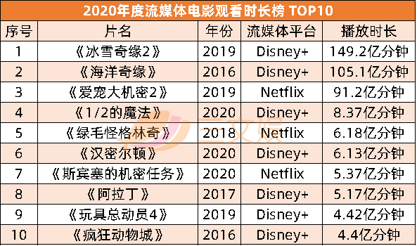其中,Disney+流媒體平台內容佔據榜單前十名中的七位,包括佔據冠、亞軍位置的迪士尼動畫《冰雪奇緣2》和《海洋奇緣》,二者的播放時長達到了149.2億分鐘和105.1億分鐘,也是榜單唯二破百億的電影;而Netflix平台內容僅佔據榜單前十中的三位,遠低於Disney+。