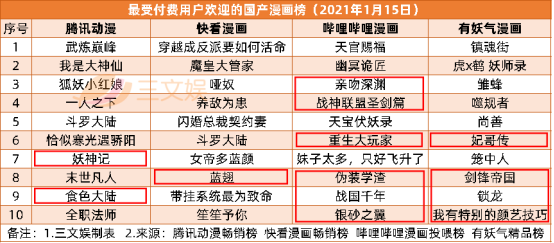 嗶哩嗶哩漫畫方面,《天官賜福》穩居榜首。截至1月15日,該漫畫更新了51話,評分9.9分,本月累計獲月票數3.29萬張,粉絲值71.19萬,互動數60.8萬。
