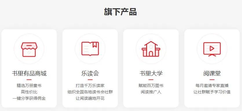 書裏有品旗下產品有“書裏有品商城”、“樂讀會”、“書裏大學”、“閲課堂”等。