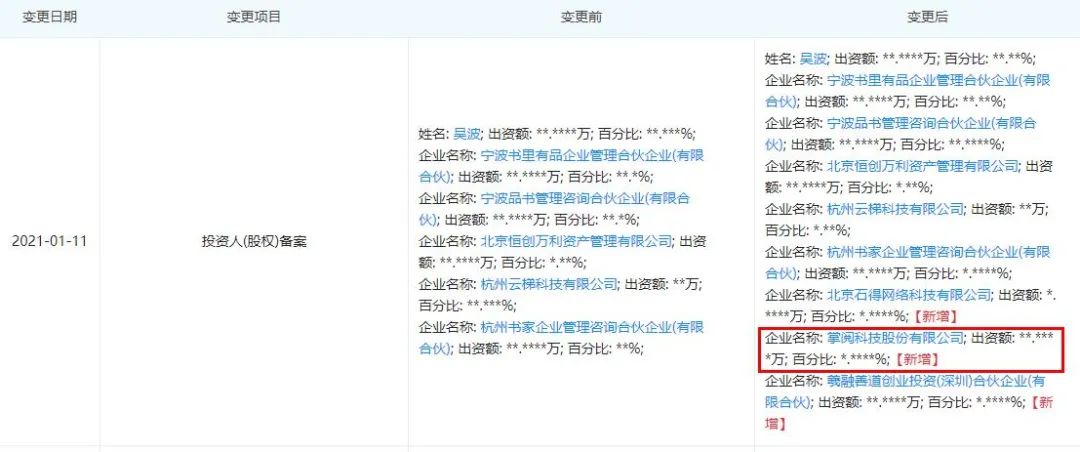 1月11日,杭州書裏有品科技有限公司發生工商變更,新增投資人之一為掌閲科技股份有限公司,佔股比例5.8824%。