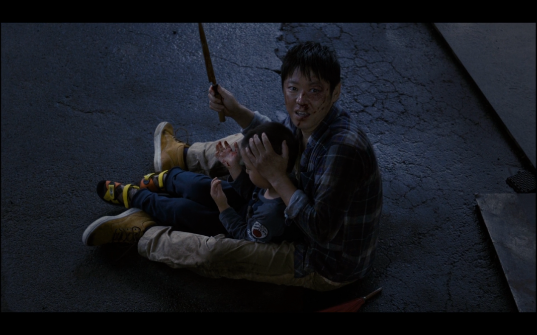 裏子被家中小孩撞見,受驚的她滾下樓梯逃走,刀掉到地上;