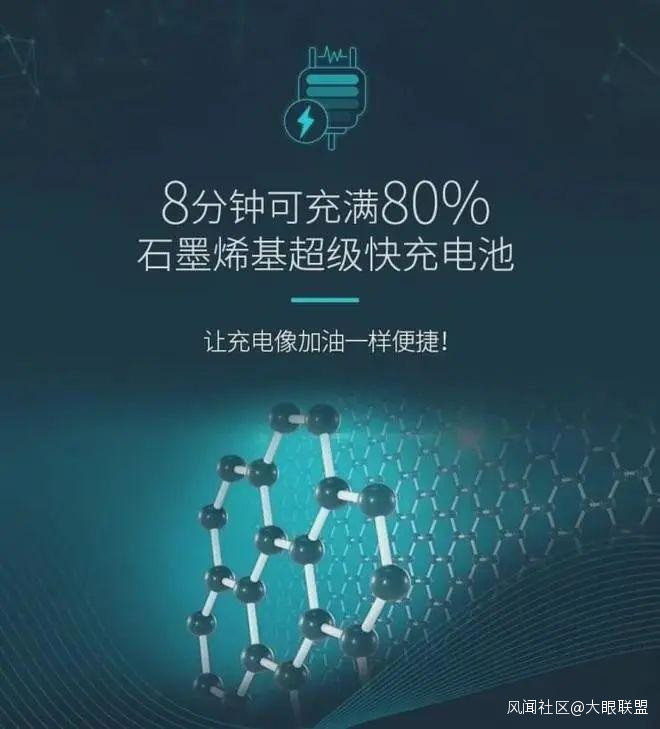 新電池採用了石墨烯技術,石墨烯基超級快充電池可在8分鐘充滿80%,同時硅負極電池讓電動車NEDC續航達1000公里。