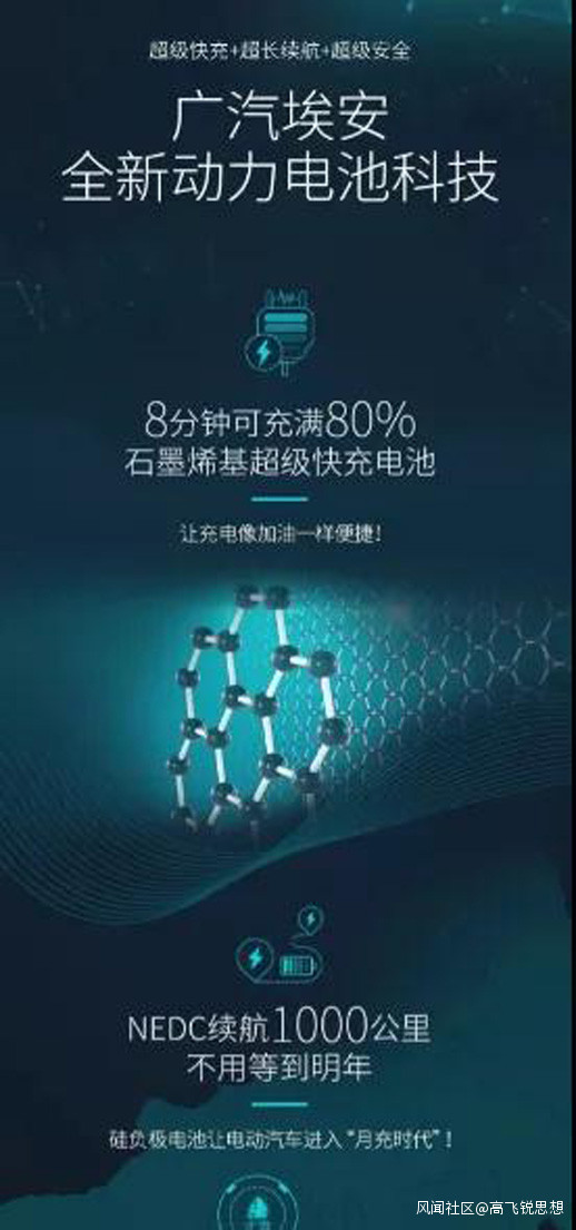 據廣汽集團旗下的廣汽埃安發佈的全新動力電池科技預告,其採用石墨烯技術的石墨烯基超級快充電池可8分鐘充滿80%,同時硅負極電池讓電動車NEDC續航達1000公里。