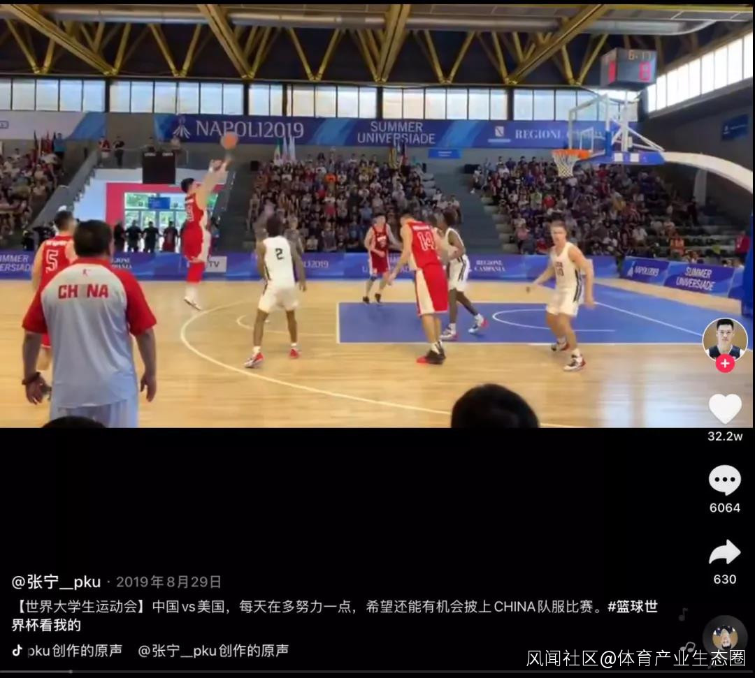 學生時代,他是北大三冠王的核心成員,還曾代表國家隊出征過世界大學生運動會。張寧主頁的置頂視頻便是他在世界大學生運動會上,中國VS美國一戰的個人集錦,獲得了32.2萬點贊。畫面裏,出色的遠投技術和不虛美國同齡球員的對抗能力,昭示着張寧學生時代的意氣風發。