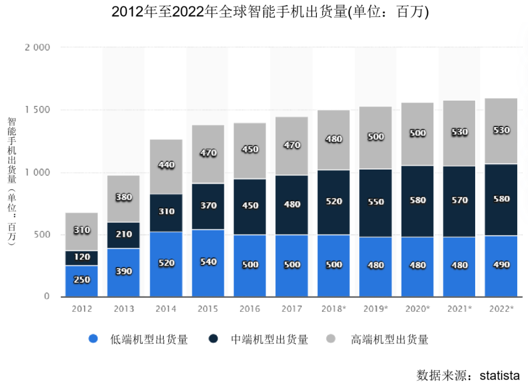 據調研機構Statista的統計,2018年,手機中端市場的容量首次超過了低端市場,在售出的超過15.5億部智能手機中,有近5.2億部是中端智能手機,首次超過了低端類別。