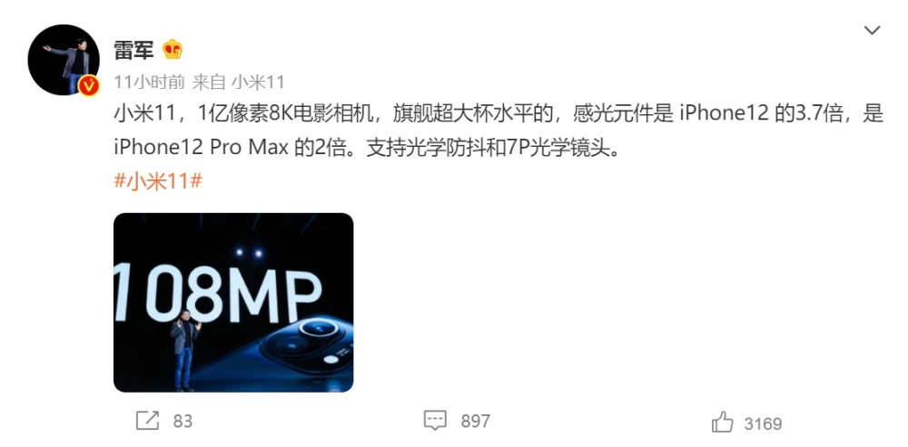 小米10的高端首戰博得消費者的青睞,小米11也擁有着驍龍888的先發優勢,核心配置上保持了高端品牌建設的連續性。而雷軍的一條微博也首次對標蘋果iPhone12,高端“野心”已經展現。