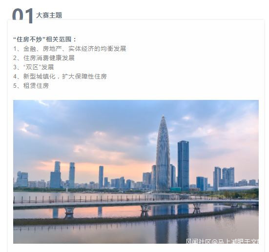 按照要求,此次徵文大賽的主題為“房住不炒”,相關範圍包括金融、房地產、實體經濟的均衡發展;住房消費健康發展;“雙區”發展;新型城鎮化,擴大保障性住房;租賃住房。