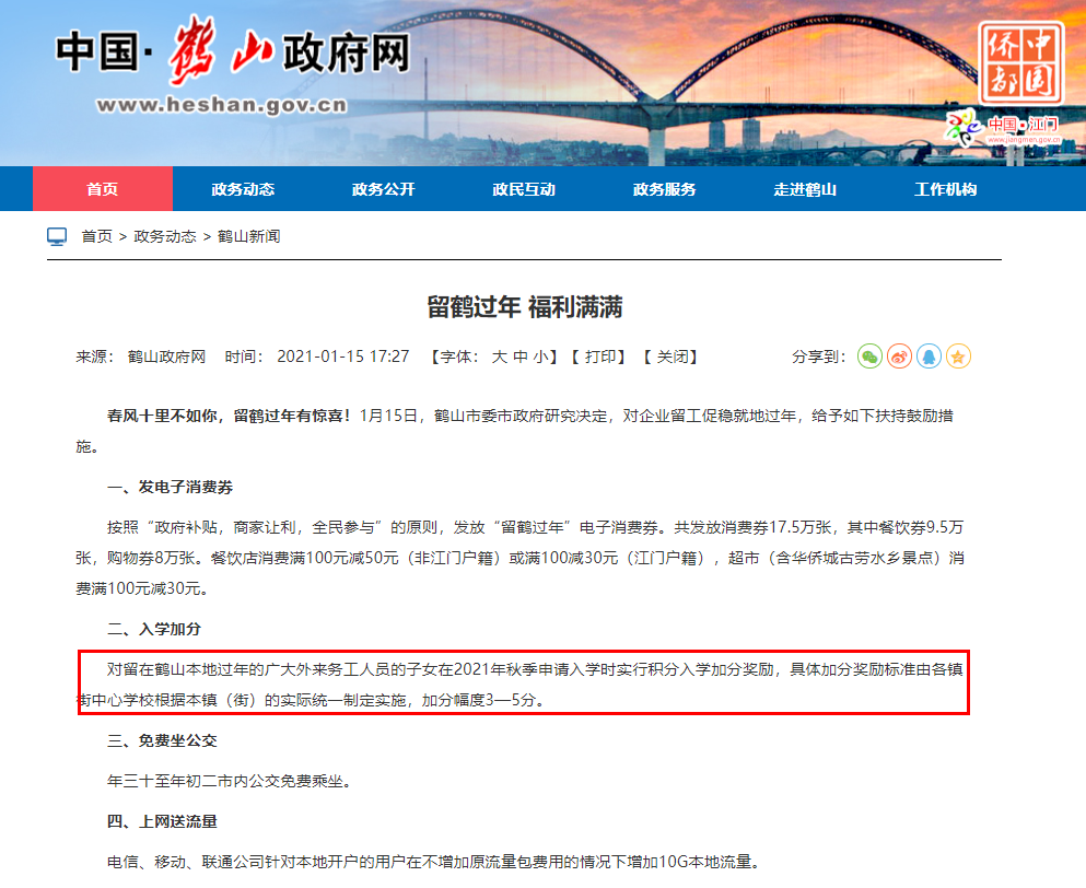 根據鶴山政府1月15日網發佈內容,留在鶴山本地過年的廣大外來務工人員的子女,在2021年秋季申請入學時可以獲得積分入學加分獎勵。具體加分獎勵標準由各鎮街中心學校根據本鎮(街)的實際統一制定實施,加分幅度3—5分。