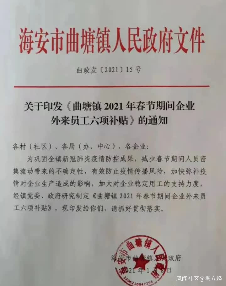 1月8日,海安市曲塘鎮出台《曲塘鎮2021年春節期間企業外來員工六項補貼》,其中,留在海安過春節外來員工,每人發放生活補貼500元。