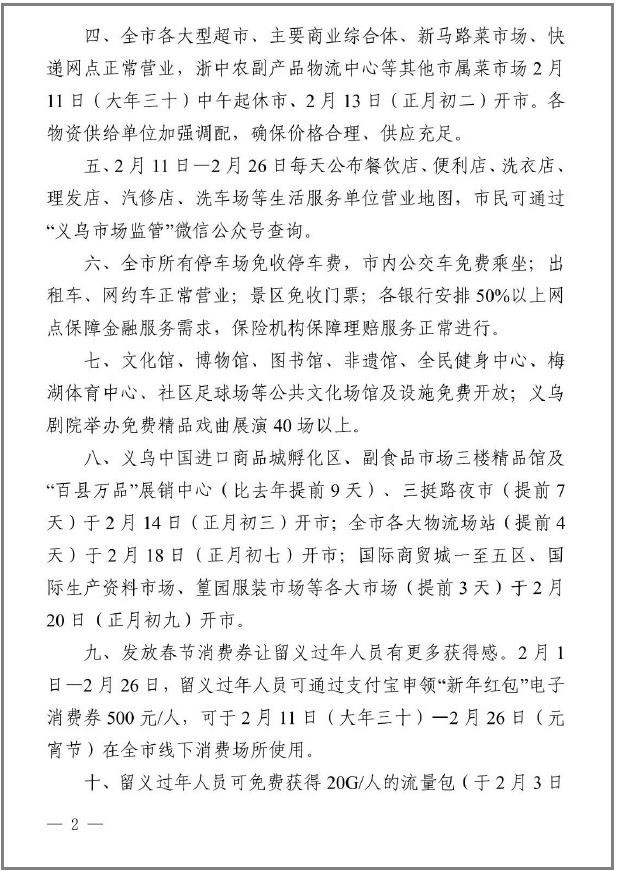 此外,文化館、圖書館、博物館、全民健身中心等公共文化場館及設施將免費開放;在醫療衞生方面,全市醫療機構將在2月14日至2月21日間免受門診、急診掛號費;教育方面,義烏中小學將舉辦免費冬令營活動,以解決留義過年人員子女“看護難”的問題……