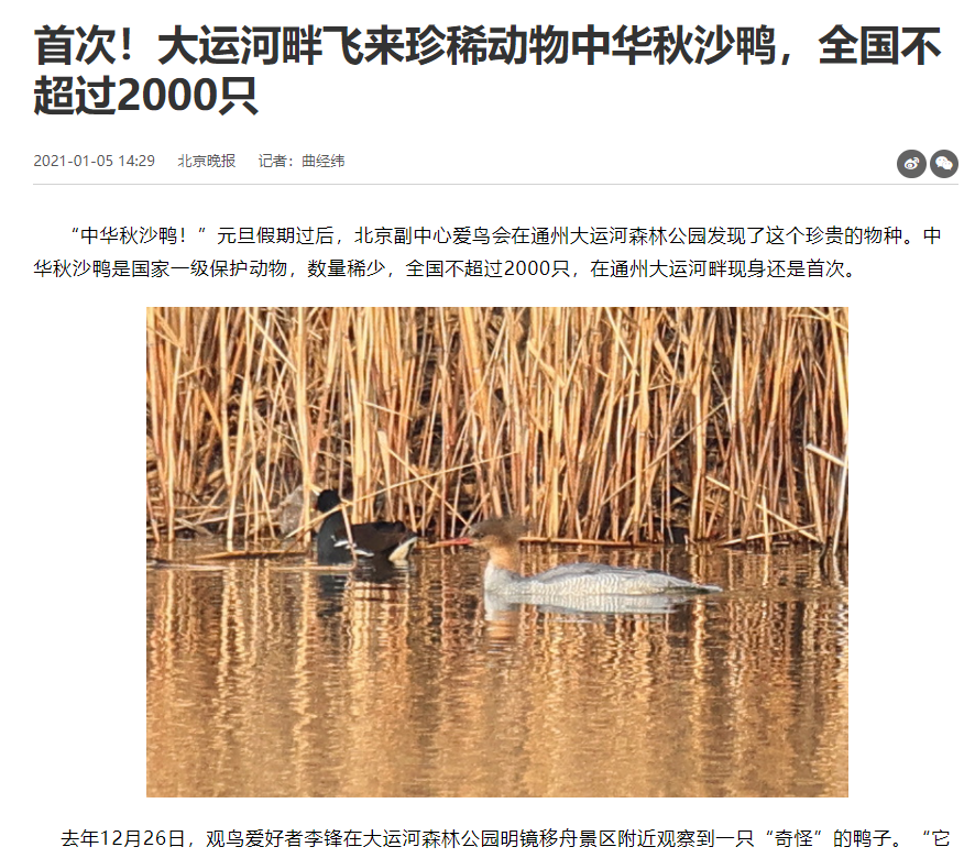 “去年底,有觀鳥愛好者在大運河森林公園觀測、拍攝到一隻中華秋沙鴨,這很可能是第一次在通州區觀測、拍攝到這種國家一級保護動物!”