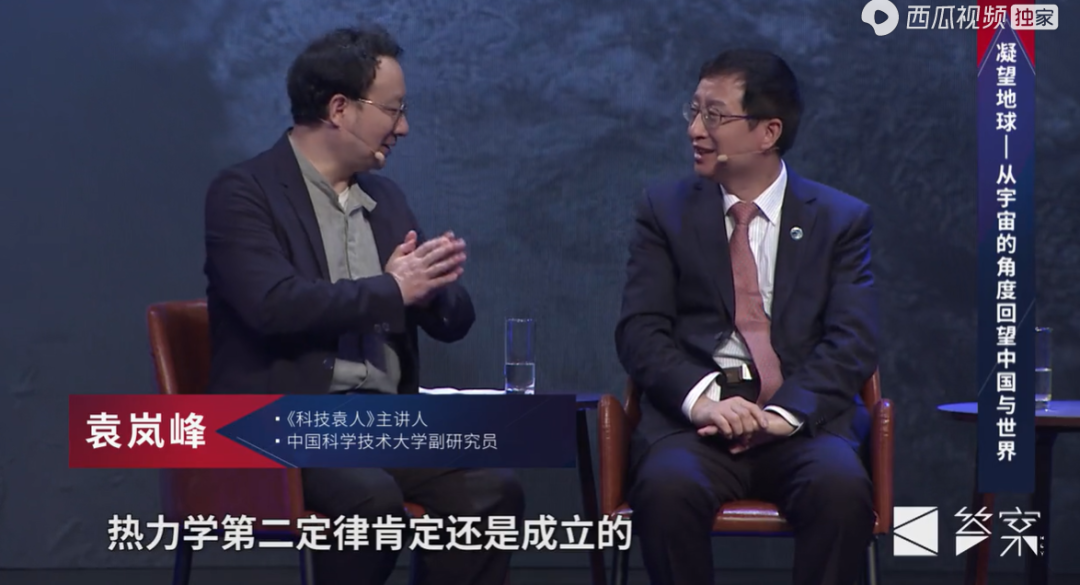 袁嵐峯(《科技袁人》主講人、中國科學技術大學副研究員):我倒是有個一句話解釋,就是説在宇宙這個尺度上,熱學第二定律肯定還是成立的,實際上它熵還是在增大的,但是因為有人在膨脹,所以它整個體系能夠包含的熵是在飛快的增大,所以它能夠容納的熵也越來越大,所以我們並沒有違反熱力學第二定律,實際上我們是在局部出現有序現象,但是在整體上它的熵還是變得更大了。
