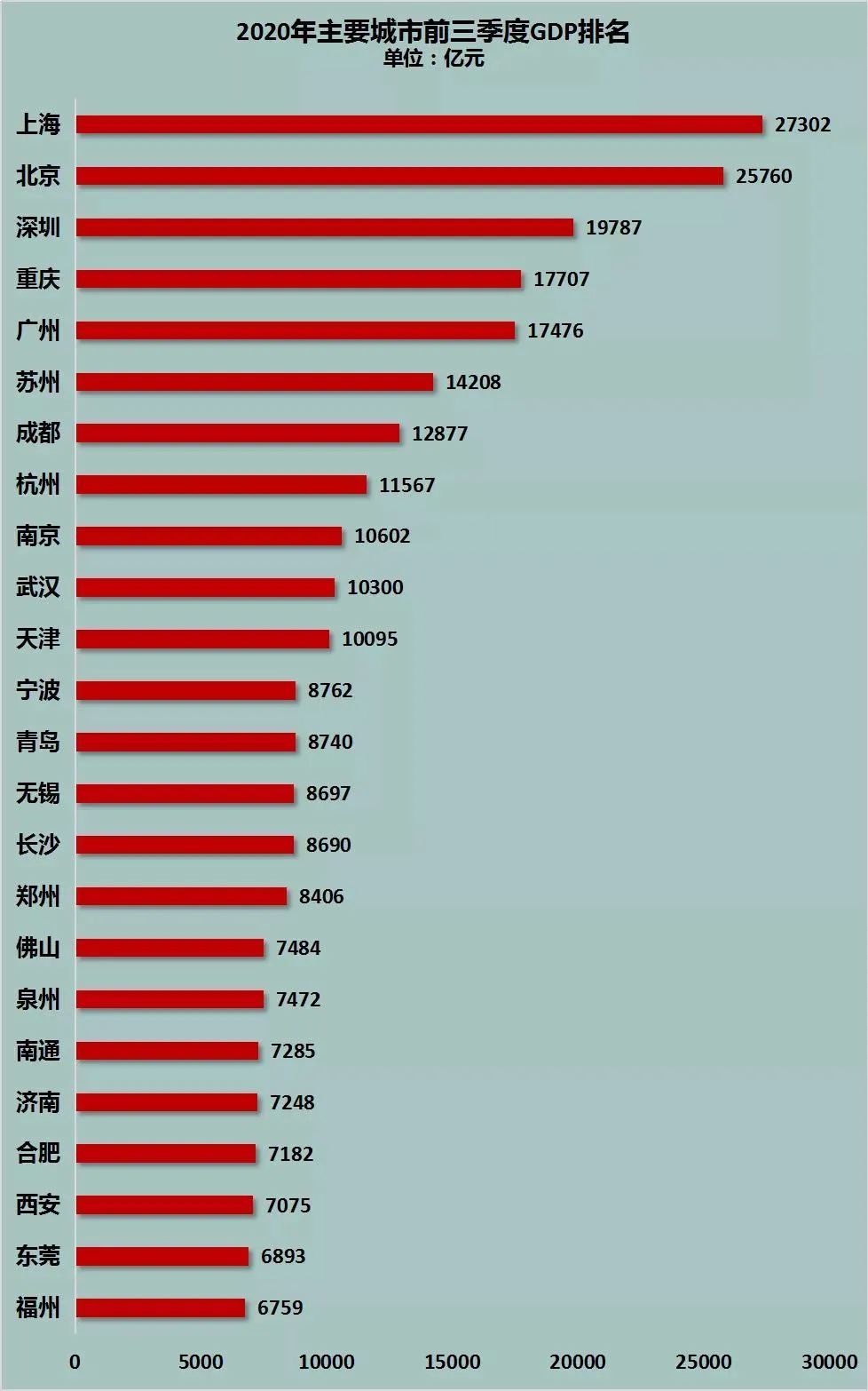 從2020年前三季度的GDP20強榜單看,北方城市除了北京、天津,另外也只有青島、鄭州、濟南。並且它們距離衝刺十強,都還有相當大的距離。
