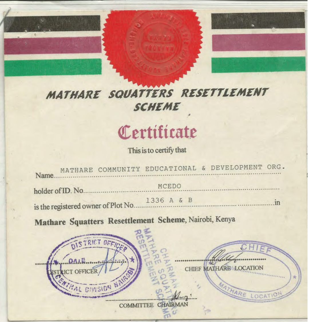原來房產證產生於1990年代肯尼亞政治改革時的一次房屋確權,這個確權並沒有落實到最後,但是就因為這次確權,證件這種形式流傳了下來,成為今後貧民窟內部土地流轉的一個重要的依據,所以其實每家每户都有這樣一個土地證。