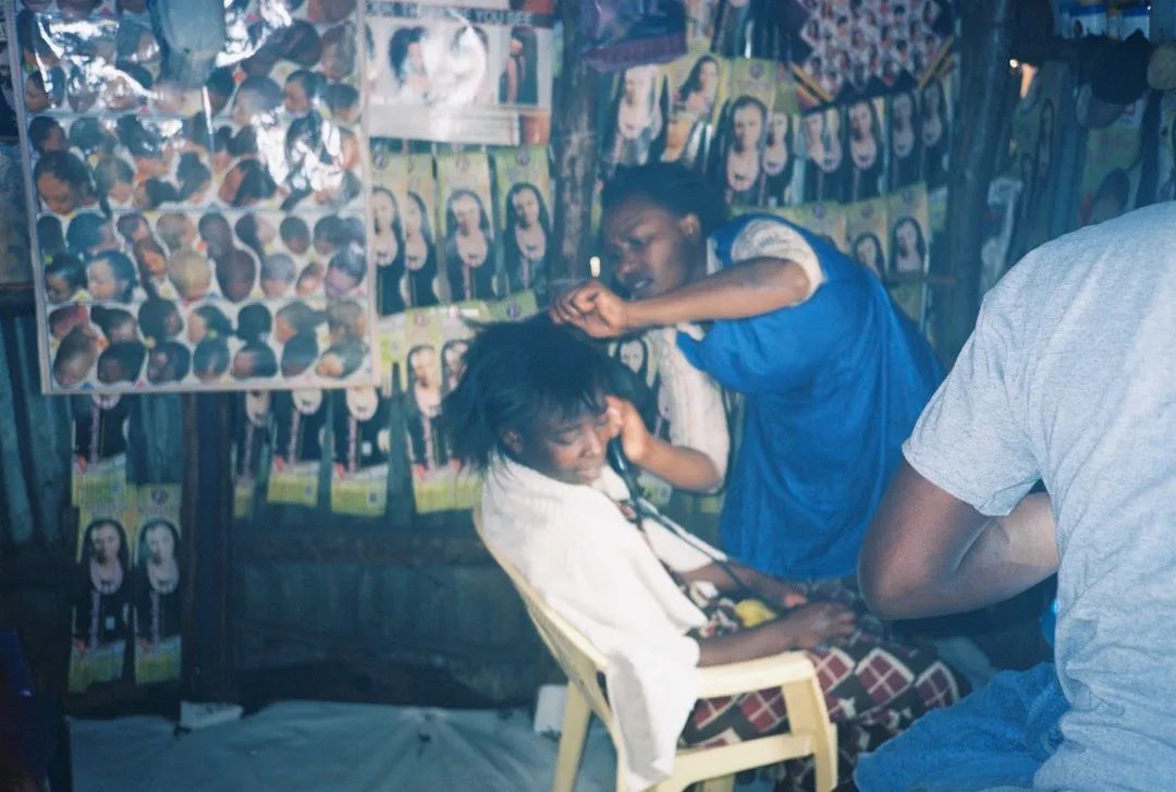 比如他拍了他的姐姐去理髮的照片,這個髮廊看起來很簡單,但是牆面上五彩紛呈,有各種形態的假髮。