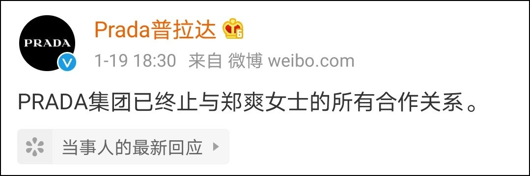 19日晚6時30分,Prada普拉達集團通過官方微博發佈消息,宣佈終止與藝人鄭爽的合作關係。