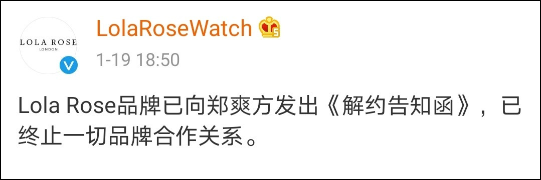稍晚時分,英國品牌Lola Rose手錶也宣佈,已經向鄭爽發出解約函,並終止一切品牌合作關係。