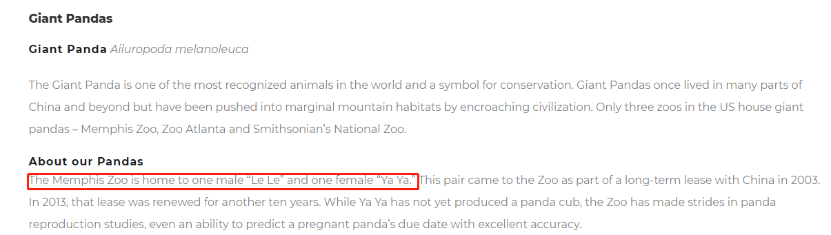 在美國孟菲斯動物園(Memphis Zoo)官網可以看到,2003年,該動物園通過租賃協議迎來了雄性大熊貓“樂樂”和雌性大熊貓“丫丫”,2013年,該動物園又續約10年。在介紹頁面,孟菲斯動物園自豪地宣稱自己當時成為了全美三家擁有大熊貓的動物園之一。