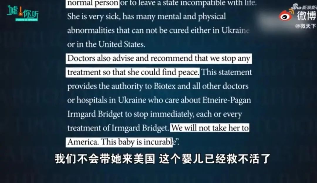 《Motherland》裏記錄了一個被拋棄的小女孩布里奇的故事。這個孩子由於代孕媽媽早產導致腦損失,剛生下來,就被來自美國的生物學父母拋棄在烏克蘭,當布里奇五個月大的時候,她的父母要求關掉她的生命維持機器。