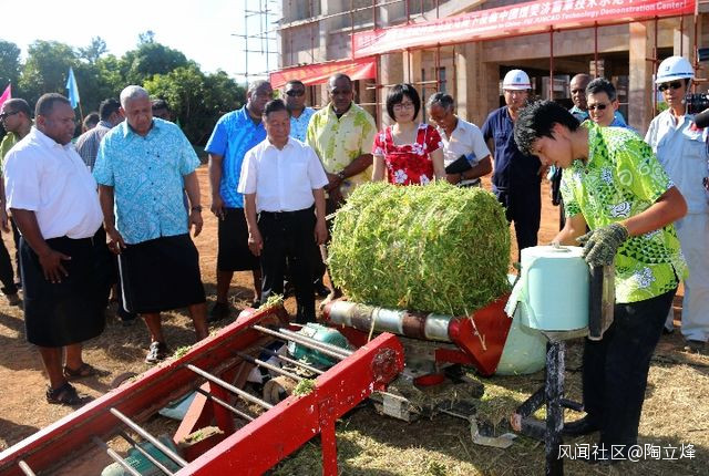 (林佔熺在中國援斐濟菌草技術合作項目第五期菌草技術培訓班上為斐濟當地農民演示如何處理菌草的技術,圖自新華社)