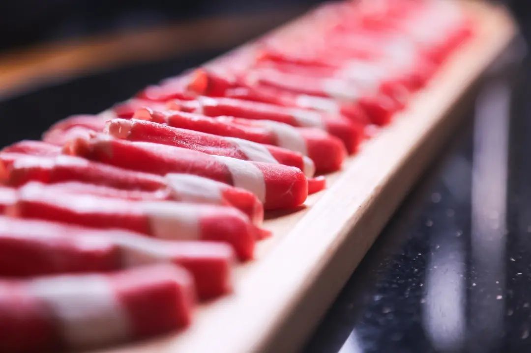 這兩種肉磚切成肥牛卷之後,會有非常明顯的一道紅一道白的肥瘦分界,而且特別整齊。