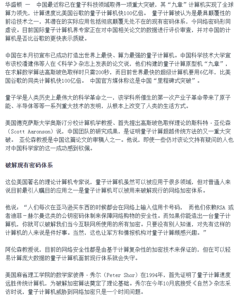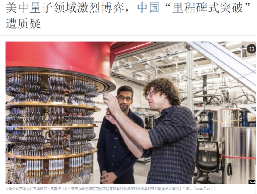 《美國之音》還説,“中國在本月初宣佈已成功打造出世界上最快、算力最強的量子計算機”,“中國官方媒體稱這是中國‘里程碑式突破’”。