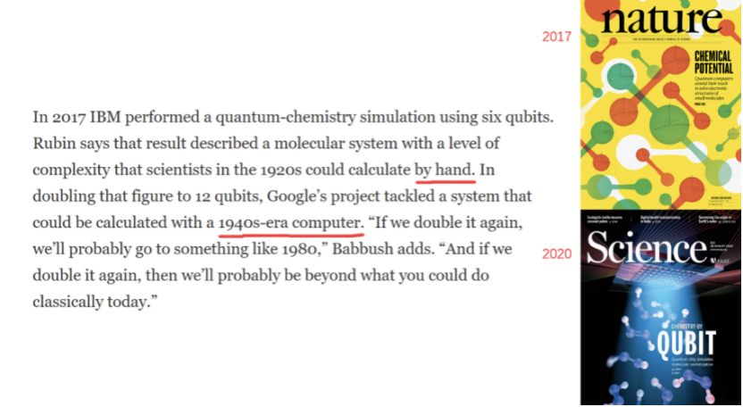懸鈴木取樣200秒獲得的數據,當時最強的經典計算機需要算一萬年。雖然IBM有反對意見,説稍微改進一下算法,就能把經典計算機消耗的時間從一萬年減到兩天半,但兩天半畢竟也比200秒長得多。所以科學界公認,谷歌確實實現了量子優越性。至於優勢是多少倍,那是細節問題(量子霸權實現了嗎?谷歌的“一萬年太久”,IBM的“只爭朝夕”,和中國的“百舸爭流” | 袁嵐峯)。