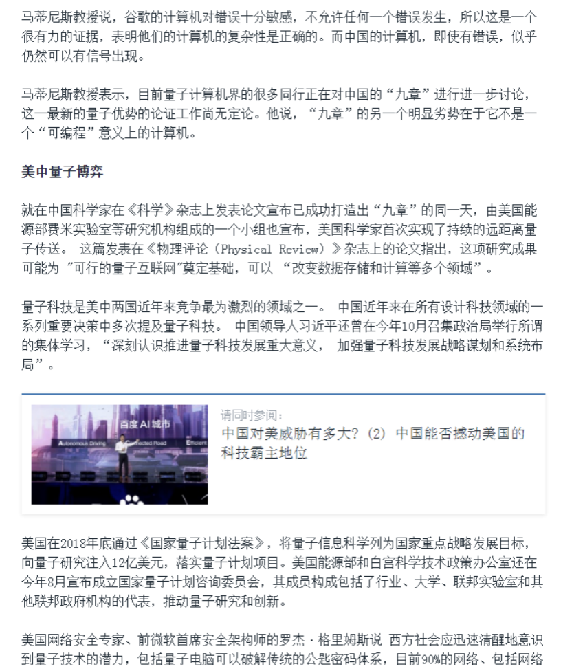 讓我們回到《美國之音》的報道。在對所謂“中國官方媒體”含沙射影和拉馬蒂尼斯的虎皮作大旗之後,這篇報道的最後一節達到了一個酸度值的高峯。這一節的標題是“美中量子博弈”,然後正文是: